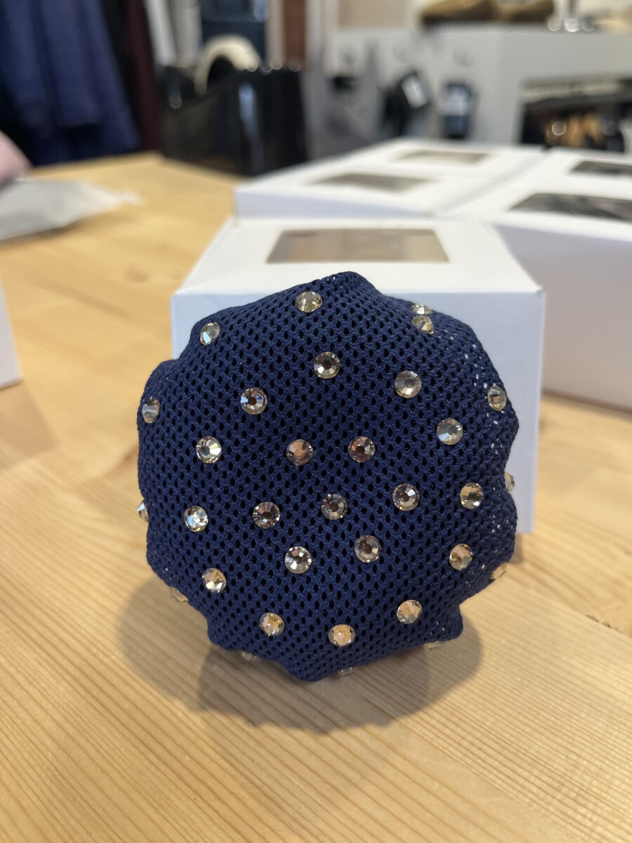Knotsetje Navy Champagne Strass . Knotsetje handgemaakt, bestaande uit een haarnetje met flonkerende kristallen, elastisch koord om te sluiten en een haardonut. Wordt afgeleverd in een afgesloten doosje.