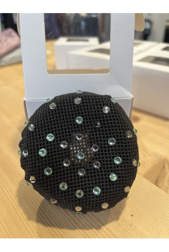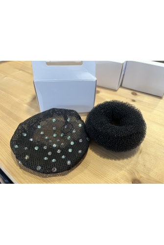 Knotsetje Zwart Groen & Chrystal Strass. Knotsetje handgemaakt, bestaande uit een haarnetje met flonkerende kristallen, elastisch koord om te sluiten en een haardonut. Wordt afgeleverd in een afgesloten doosje.