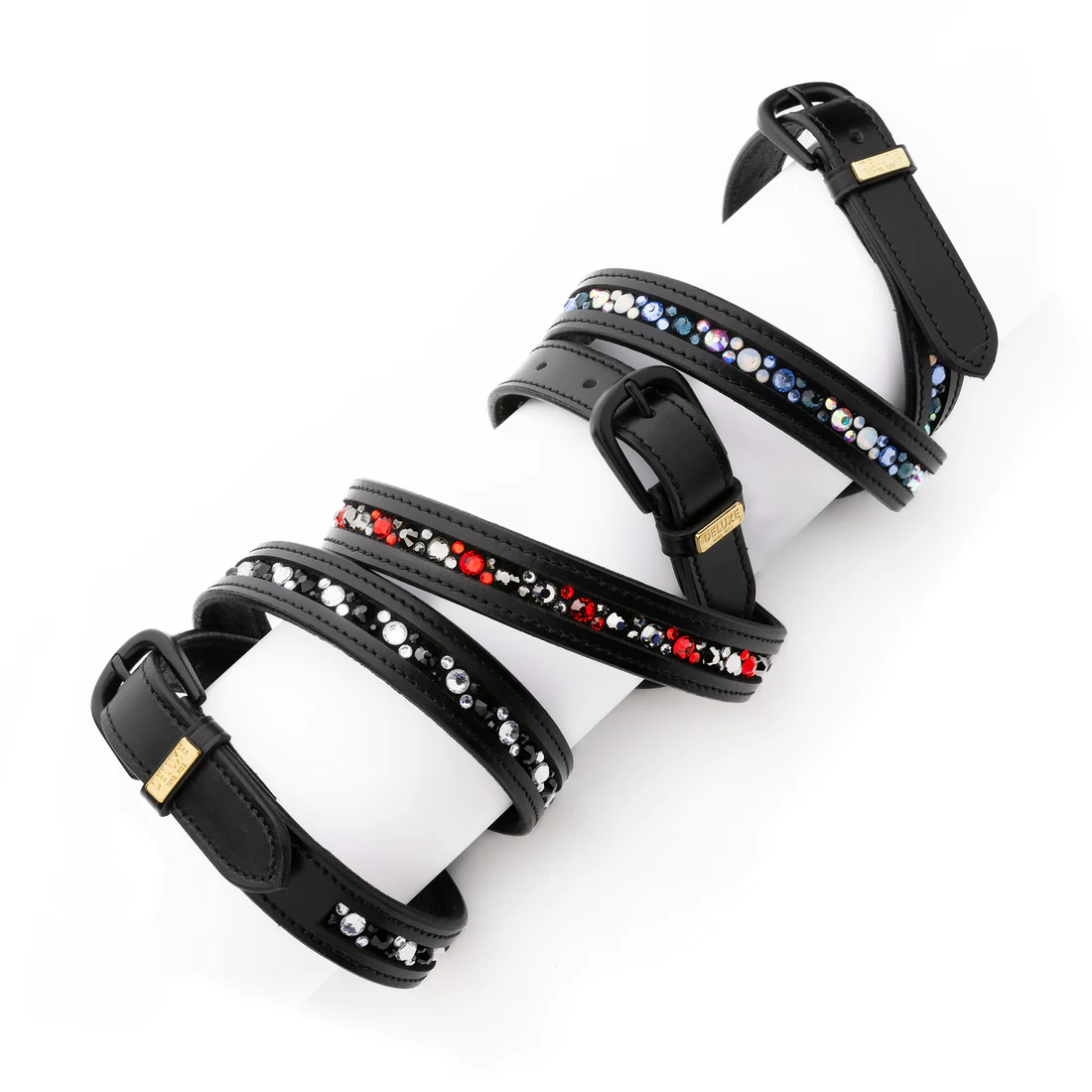 MrsRos Stellux riem is gemaakt van echt zwart leer en is voorzien van steentjes in Black, Chrystal en Cheeky Red met een goudkleurig metalen plaatje met Mrs. Ros logo. Een top-accessoire voor iedereen die van bling houdt.